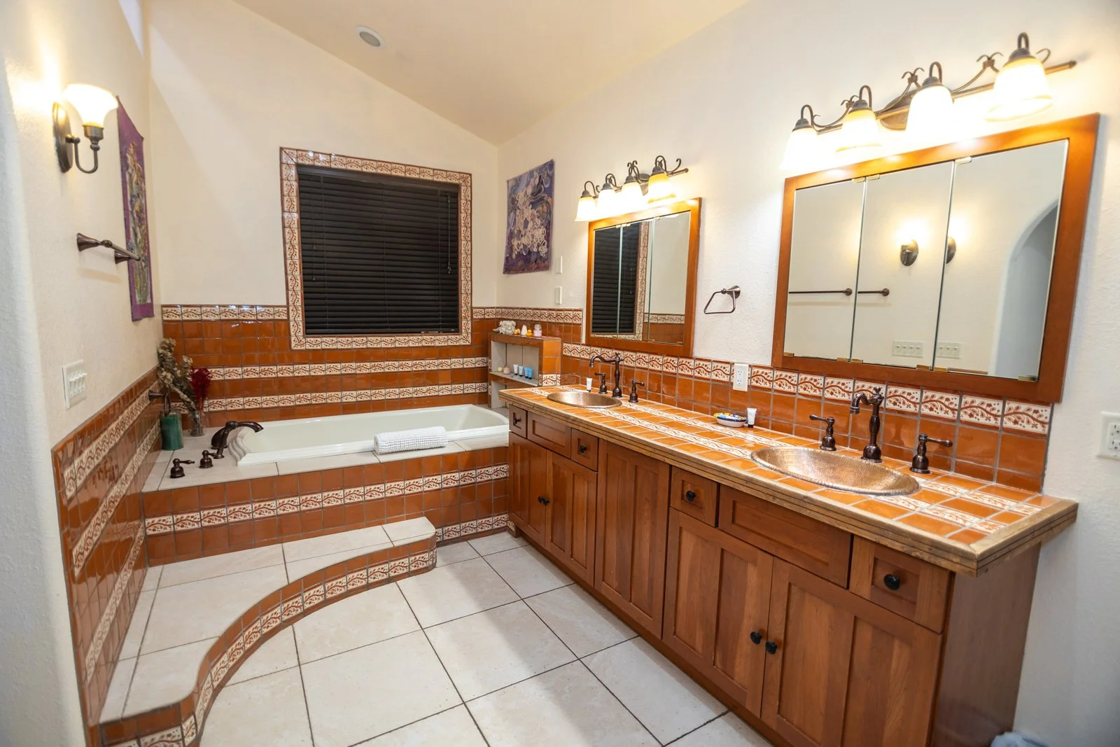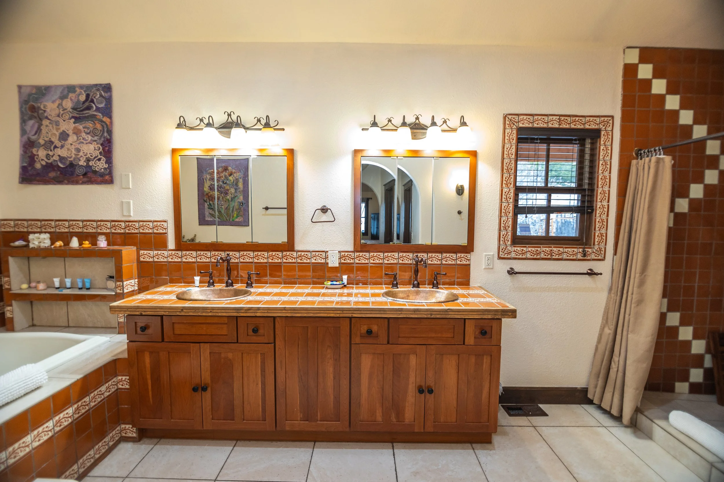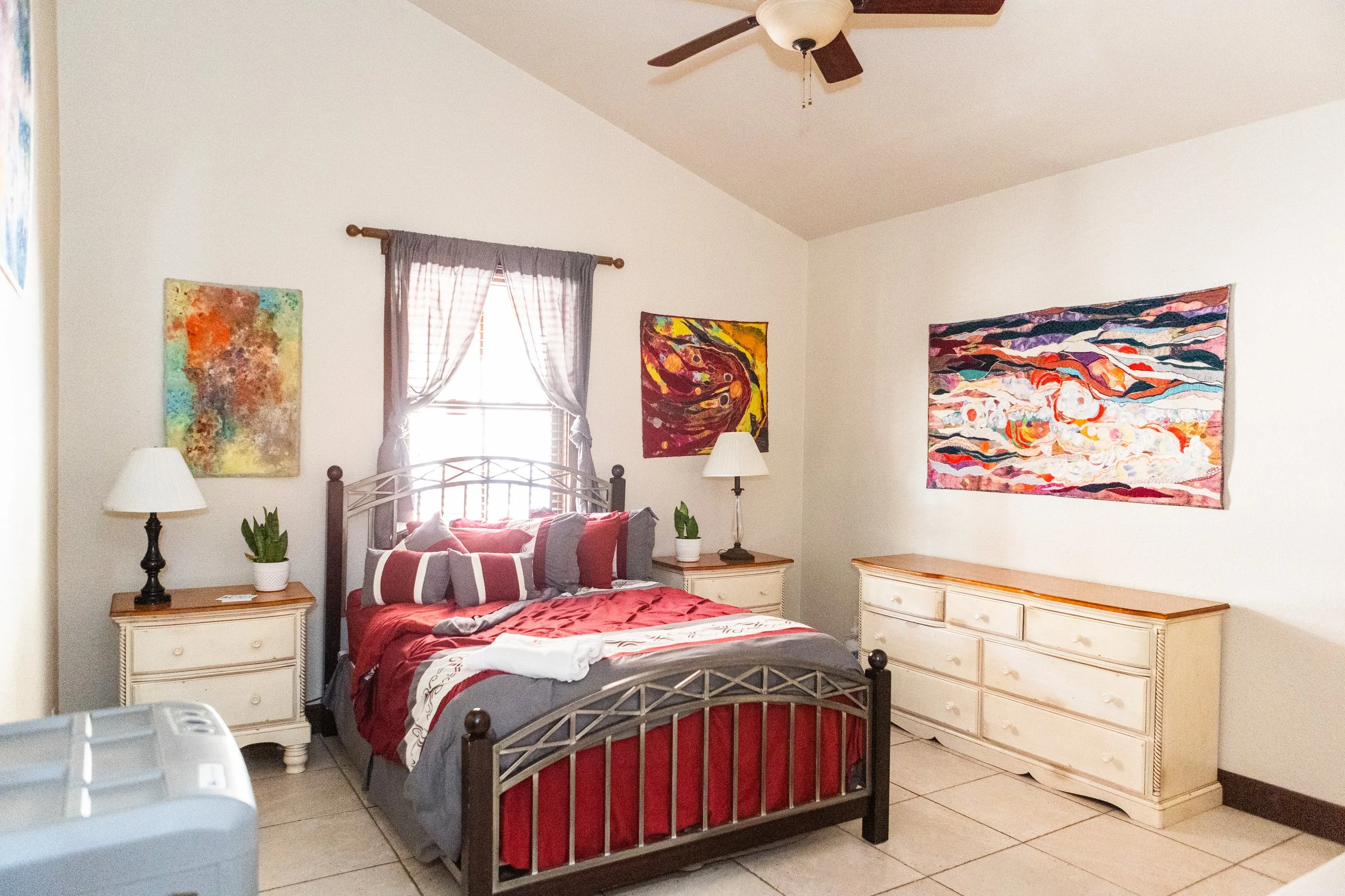 Room 1 (the master suite): 1 king bed and two queen-sized convertibles. Full Bathroom with a private toilet room, walk-in shower, and double sinks.